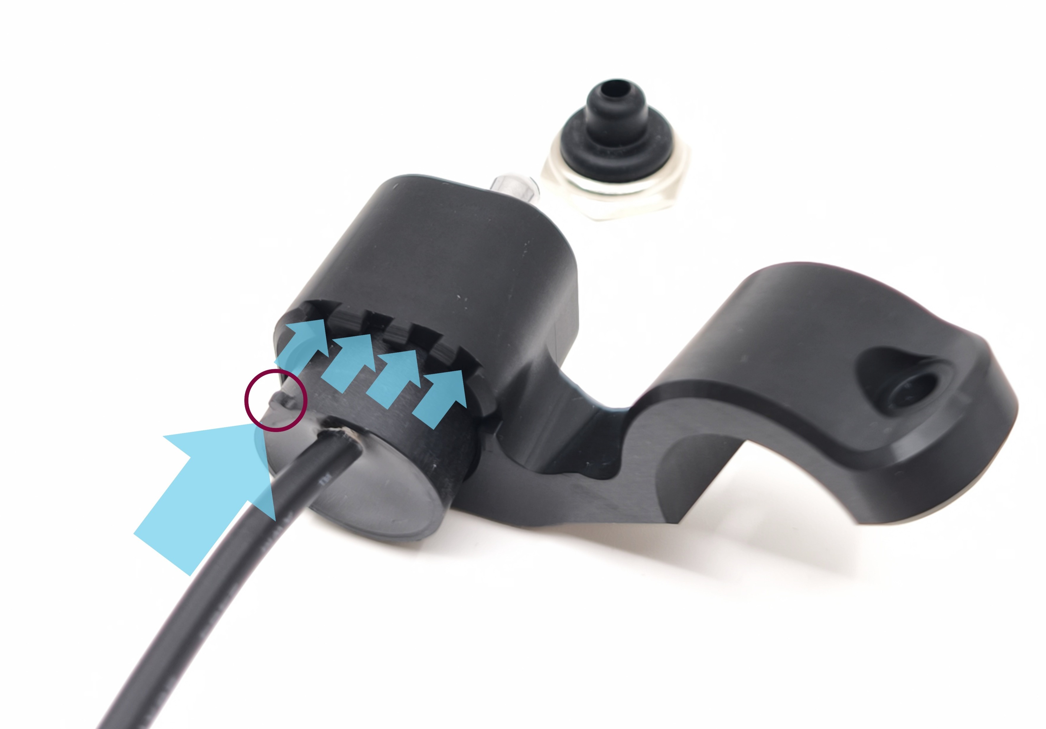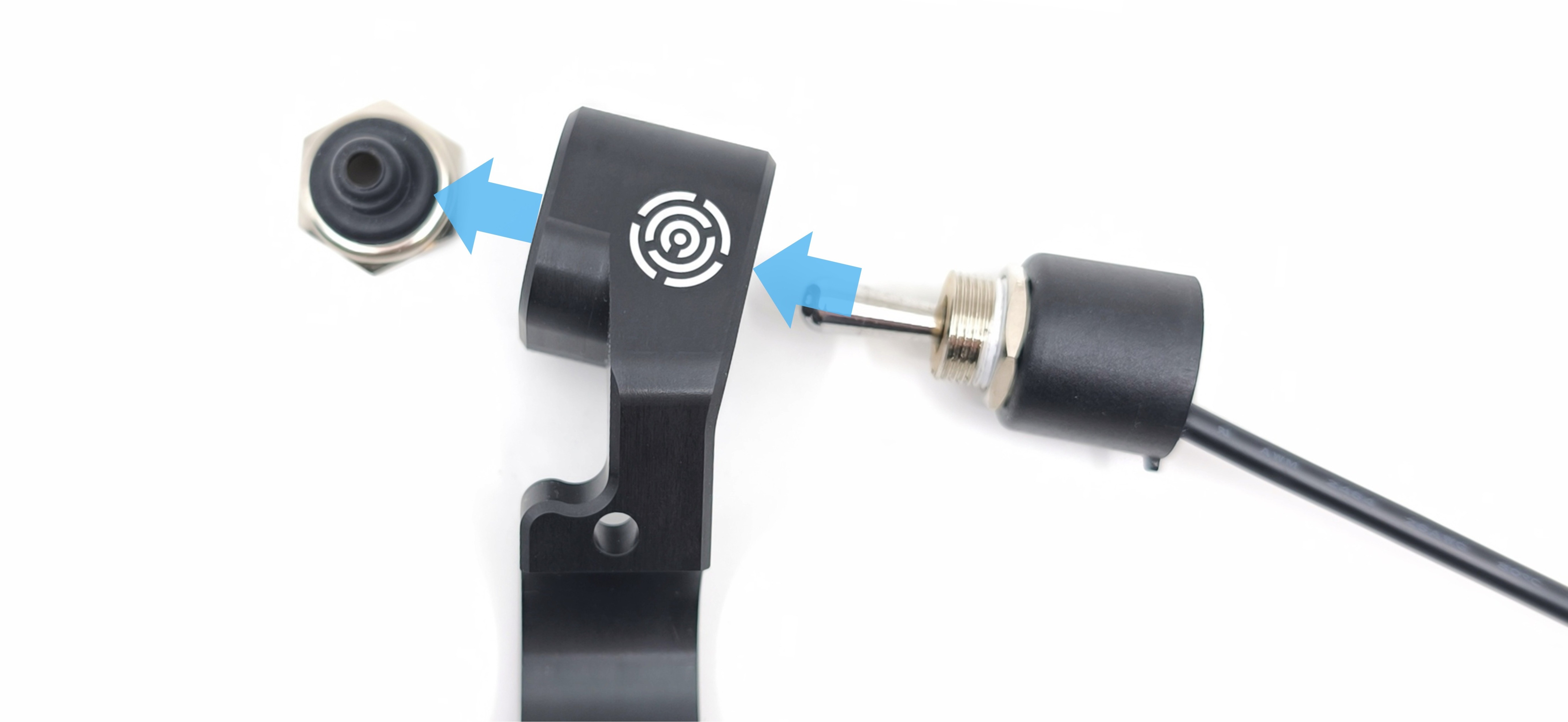 Choose your toggle press orientation by inserting the pin in one of the grooves. This is highly dependent on your riding position and other factors. It may be necessary to re-adjust this later after field-testing. Then, fix it with the nut with a rubber sleeve: