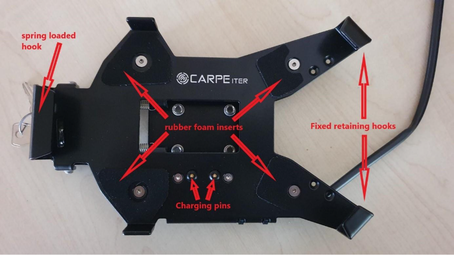 2.2. Carpe Iter Holder (“Holder”) for motor vehicles, especially motorcycles. The Holder is sold in two versions – charging (includes a proprietary power source for the Device and pogo pin charging connector) and non-charging. In case you decide to use non-charging version of the Holder, CI Pad can be charged via the M8 charging cable from our proprietary power source (power source is included with a special CI Pad set for non-charging Holder or can be purchased separately). When this manual refers to charging via the Holder, it refers to the charging version of the Holder.