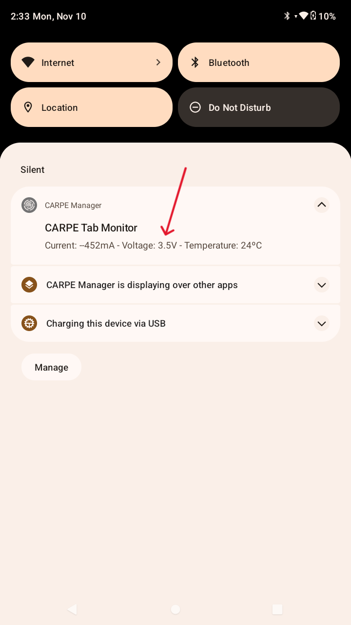 11.9.1. System battery level indicator will not match voltage level indicated by the Carpe Manager most of the time. That is normal.