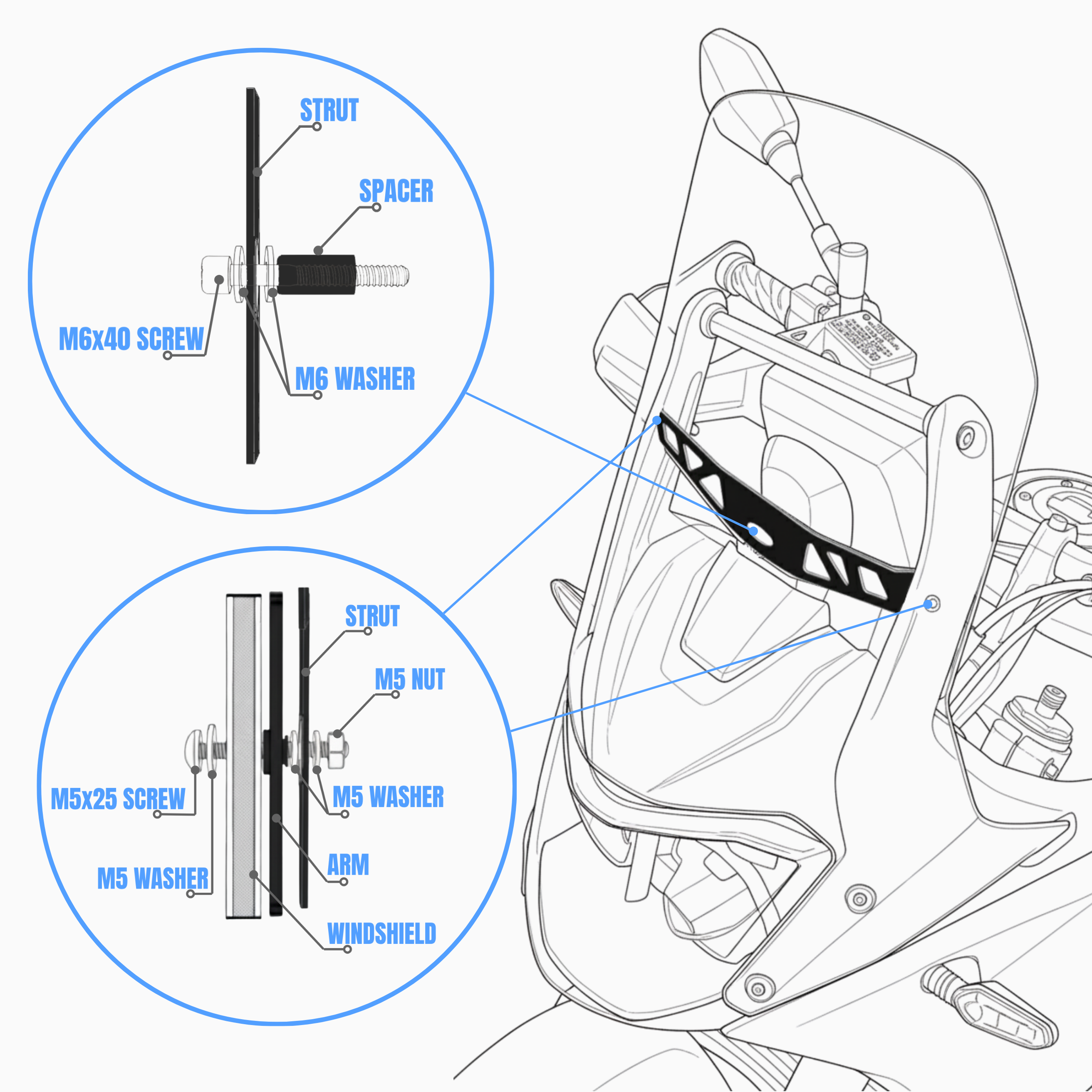 - On one side, put the M5 screw with a washer to one of the top holes from the windshield side and tighten it progressively. At certain point, insert washer in between the rubber nut and the strut. Proceed with tightening of the screw to fix the windscreen in place.