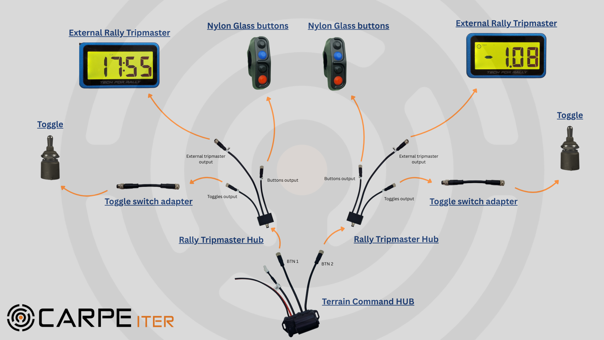 Carpe Iter Controllers allow you to control up to 2 Tripmaster units and an Android navigation device at the same time! The problem many riders face is a cluttered handlebar with too many different remotes for different devices. Carpe Iter provides the solution with a unified controller that bridges the gap between legacy rally hardware and modern digital power. Your leverage is a simplified cockpit that reduces cognitive load, allowing you to focus entirely on the track instead of searching for buttons.